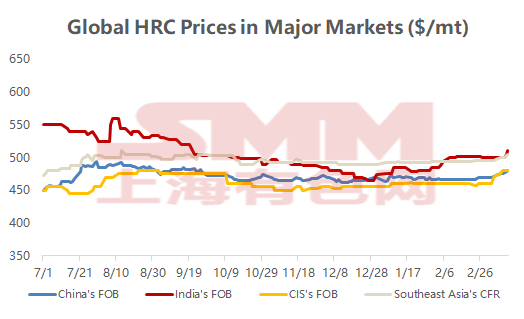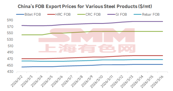 Affected by the US-Iran conflict, tight energy supply and sharply higher fuel costs, compounded by exchange rate fluctuations, have continuously pushed up China's export offers in recent days. Compared with the beginning of the month (March 6), SMM HRC prices have been raised by $9/mt; galvanizing prices rose by $11/mt; CRC rose by $5/mt; billet rose by $6/mt; and rebar rose by $6/mt.