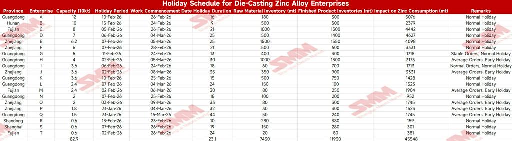 Approaching the 2026 Chinese New Year, SMM conducted communication and research on the pre-holiday break arrangements of domestic die-casting zinc alloy enterprises. This survey covered 20 enterprises, with a total annual capacity of 829,000 mt, involving a zinc consumption scale during the holiday period of approximately 45,548 mt.