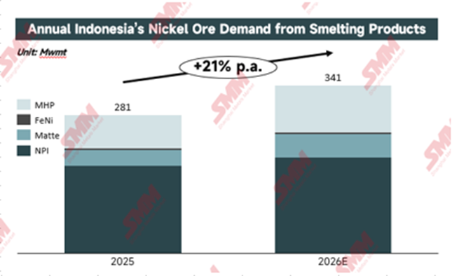 According to SMM’s latest calculations, the total nickel ore requirement for 2026, which includes the demand from NPI, FeNi, Nickel Matte, and MHP, is estimated at approximately 341 million tons, based on the production estimates of smelter's current condition. This sharp increase is primarily driven by the rapid expansion of MHP production, which utilizes higher volumes of limonite ore. This surge in consumption has intensified the pressure on smelters to secure significantly higher mining quotas.