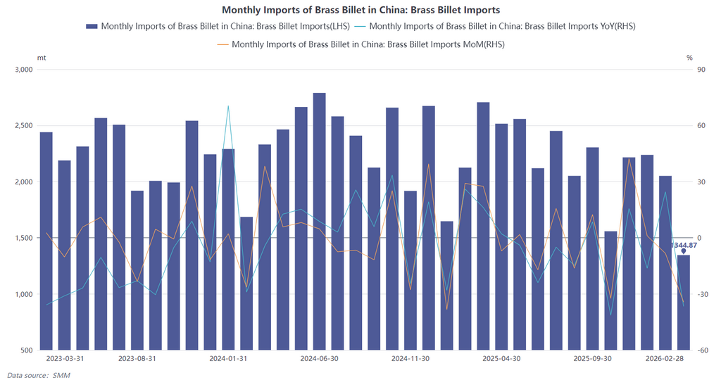 [SMM Brass Bar Flash] According to the latest customs data, China’s imports of copper-zinc alloy (brass) bars and rods stood at 2,050.01 mt in physical content in January 2026, down 8.37% MoM and up 24.53% YoY. In February, China’s imports of copper-zinc alloy (brass) bars and rods were 1,344.87 mt in physical content, down 34.4% MoM and down 36.67% YoY, marking an overall sharp decline. Cumulative imports in January-February 2026 totaled 3,394.87, down 9.94% YoY on a cumulative basis. (HS codes 74072111, 74072119, 74072190).