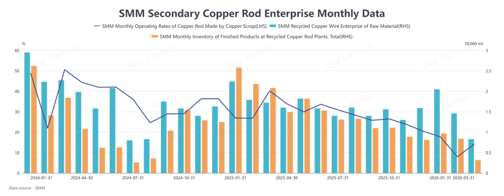 The operating rate of secondary copper rod in March 2026 was 14.25%, below the expected 16.26%, up 6.27 percentage points MoM and down 25.93 percentage points YoY. In March, China's secondary copper rod market struggled under multiple pressures including wild swings in copper prices, deepening industrial fiscal and tax policy reforms, and structural tightness in raw material supply, failing to exhibit the traditional seasonal recovery. The core market contradiction throughout the month evolved in stages — from "unclear policy expectations suppressing production resumptions" to "rigid costs eroding profits," and ultimately to "tight raw material supply constraining production" — leaving the industry mired in a predicament of "having orders but no raw materials and difficulty in making profits." In early March, market focus centered on whether local fiscal and tax policies and the operational details of "reverse invoicing" would be clarified after the Two Sessions. Elevated copper prices and an ambiguous policy outlook severely dampened enterprises' willingness to resume production. Although workers gradually returned to their posts after the Lantern Festival, actual procurement and production activities recovered slowly, with the operating rate only edging up slightly from low levels. Entering mid-March, wild swings in copper prices became the dominant factor, and market trading behavior exhibited clear "price-driven" characteristics, though actual transaction volumes saw limited increases. A noteworthy structural change was that, as secondary copper rod shifted to a premium against copper futures while scrap-produced anode plates maintained a deep discount, the processing profit differential between the two reversed. This prompted some scrap utilization enterprises to begin surveying the market, considering converting part of their scrap-produced anode plate capacity into secondary copper rod capacity, injecting a new variable of real-time profit-based capacity reallocation into the market.