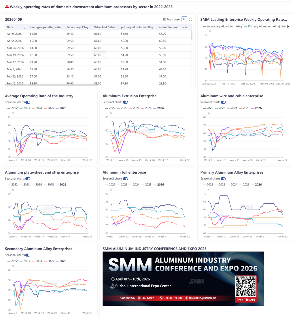 This week, the weekly operating rate of China's leading aluminum downstream processing enterprises pulled back 0.5 percentage points WoW to 64.7%. The industry continued its weak recovery pattern, with divergence among segments intensifying. The operating rate of primary aluminum alloy rose 0.4 percentage points to 56.3%, as inventory digestion drove production resumptions, but sluggish demand and cautious procurement constrained the pace. Operating rates of aluminum plate/sheet and strip and aluminum foil stayed high at 73% and 75% respectively, supported by can stock packaging, energy storage, and battery foil orders, though air-conditioner foil recovery was hindered by policy headwinds and a sluggish property market. The aluminum wire and cable operating rate held flat at 67.6%, underpinned by power grid infrastructure but constrained by high inventory and slower cargo pick-up. Aluminum extrusion pulled back 2 percentage points to 57%, with the construction segment suppressed by high aluminum prices and industrial materials dragged down by shrinking PV frame orders. Secondary aluminum edged down 0.1 percentage points to 59.3%, as insufficient consumption recovery prompted enterprises to cut production to manage inventory. Currently, core demand support came from energy storage and new energy segments, but elevated aluminum prices, peak-season demand falling short of expectations, and Middle East export disruptions constrained traditional sectors and export recovery. The aluminum processing industry exhibited characteristics of "slow recovery, underperforming in peak season." Short-term upside room for operating rates remained limited, and operations are expected to run steadily next week. Attention should be paid to the marginal impact of post-holiday orders, aluminum prices, and export policy changes on each segment.