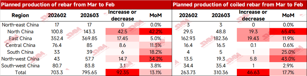 - Planned rebar production in March was 7.9565 million mt, an increase of 923,500 mt from February’s actual production, up 13.13%.