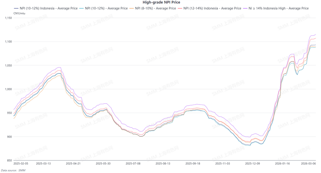 Supply side, supported by strong costs this week, smelters kept their offers firm; however, a small number of traders shipped at low prices to recover cash, resulting in wide differences in market quotations. Demand side, after the holiday, gains in stainless steel finished-product prices were limited, and steel mills showed weak acceptance of high-priced high-grade NPI. The economic substitutability of steel scrap strengthened, and most steel mills only maintained small volumes of just-in-time procurement. Overall, strong cost support combined with still-tight deliverable supply—especially the clear scarcity of high nickel unit material—kept high-grade NPI prices rising. Looking ahead, as costs are unlikely to fall and demand is expected to recover, high-grade NPI prices are expected to still have upside room.