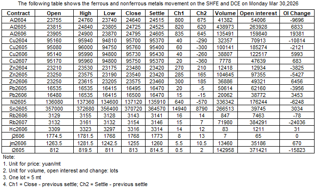 The following table shows the ferrous and nonferrous metals movement on the SHFE and DCE on 30 Mar , 2026