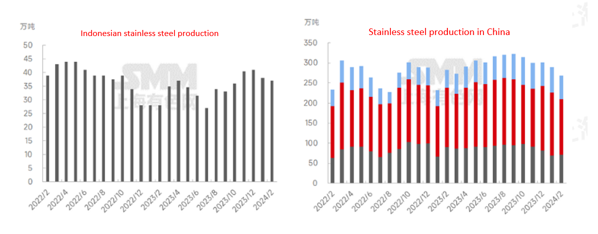 According to SMM research, the national stainless steel output in January 2024 totaled about 2.893 million tons, a decrease of about 4.05% month-on-month and a year-on-year increase of about 24.34%. Among them, the output of 200 series stainless steel was about 687,000 tons, a decrease of about 16.78% month-on-month and an increase of about 3% year-on-year; The output of 300 series stainless steel was about 1.581 million tons, a decrease of about 1.31% month-on-month and an increase of about 25.41% year-on-year; The output of 400 series stainless steel was about 625,000 tons, an increase of about 6.38% month-on-month and a year-on-year increase of about 56.64%. In addition, Indonesia's stainless steel output totaled about 380,000 tons in January, a decrease of about 7.32% month-on-month and a year-on-year increase of about 35.71%. In January, after New Year's Day, the stainless steel disk opened low and fluctuated, and the SS contract rose to 14,400 yuan/ton, and the stainless steel transaction atmosphere was active. Although it has entered the seasonal maintenance period, 300 series stainless steel production enterprises maintain production, and some steel mills have maintained the level of December due to a slight reduction in maintenance output. The 200 series stainless steel plants in North China, which are mainly used for scrap stainless steel smelting, were affected by the production capacity compliance inspection, and the production of 200 series stainless steel was affected by the production capacity compliance inspection, and the output of 200 series stainless steel was about 40,000 tons, coupled with the centralized maintenance of some steel mills in Guangxi, the output of 200 series 1 decreased by about 138,200 tons, a decrease of about 16.78% from the previous month. The output of the 400 series has climbed, and the annual output of state-owned steel mills in December has declined slightly, and the overall resumption of production in January has increased by about 37,500 tons compared with December. In February, entering the Spring Festival holiday, some domestic steel mills carried out routine maintenance during the Spring Festival, and the output declined compared with January for only 29 days in February. Due to the good superposition of steel mills' February orders, the current steel mills have a small profit margin in the production of stainless steel, and the overall maintenance impact is expected to be less. Abroad, stainless steel in the first quarter is still in the off-season of consumption, Indonesian steel mills adjusted the pace of production, output slightly lower, in February is expected to Indonesian stainless steel output decreased by about 2.63% month-on-month. It is estimated that the domestic stainless steel output in February will be about 2.684 million tons, a decrease of 7.22% from the previous month. Among them, the output of 200 series stainless steel was about 721,000 tons, an increase of about 4.95% month-on-month; The output of 300 series stainless steel was about 1.377 million tons, a decrease of about 12.9% from the previous month; The output of 400 series stainless steel was about 586,000 tons, a decrease of about 6.24% from the previous month.
