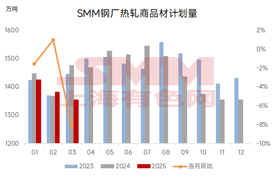 According to the latest SMM tracking, the planned production of hot-rolled products by 39 mainstream HRC steel mills in March totaled 13.5438 million mt, a decrease of 203,700 mt or 1.5% compared to the actual production in February. On a daily average basis, with three more days in March compared to February, the daily planned production of hot-rolled products in March was 436,900 mt, down 54,100 mt or 11.0% MoM from the actual daily average production in February.