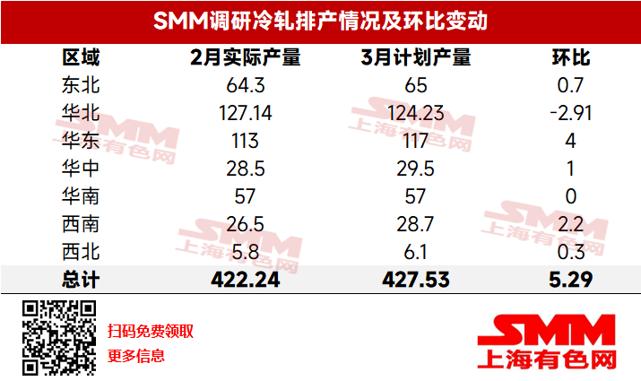 According to the latest SMM tracking, the planned production of cold-rolled products by 31 mainstream cold-rolled steel mills in March totaled 4.2753 million mt, an increase of 52,900 mt or 1.3% compared to the actual production in February. On a daily average basis, with three more days in March compared to February, the daily planned production was 137,900 mt, down 8.5% MoM from the actual daily average production in February.
