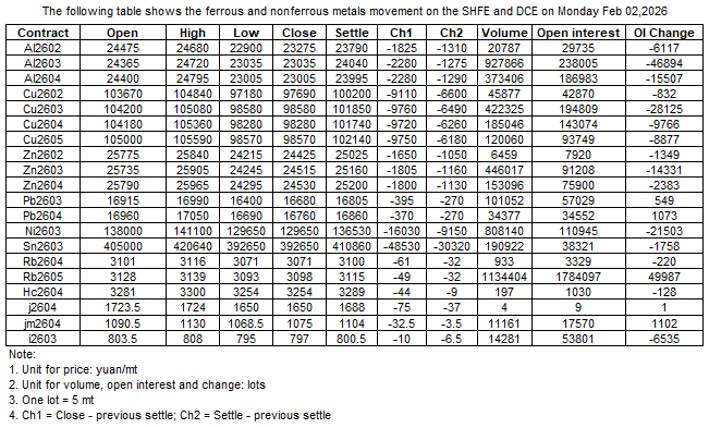 The following table shows the ferrous and nonferrous metals movement on the SHFE and DCE on 02 Feb , 2026