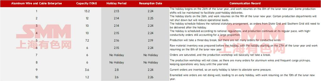With the Chinese New Year approaching, what are the holiday plans for domestic aluminum wire and cable enterprises in 2026? This SMM survey covers 10 aluminum wire and cable enterprises, involving a total capacity of 752,000 mt, and clearly categorizes them into three types based on their holiday schedules.