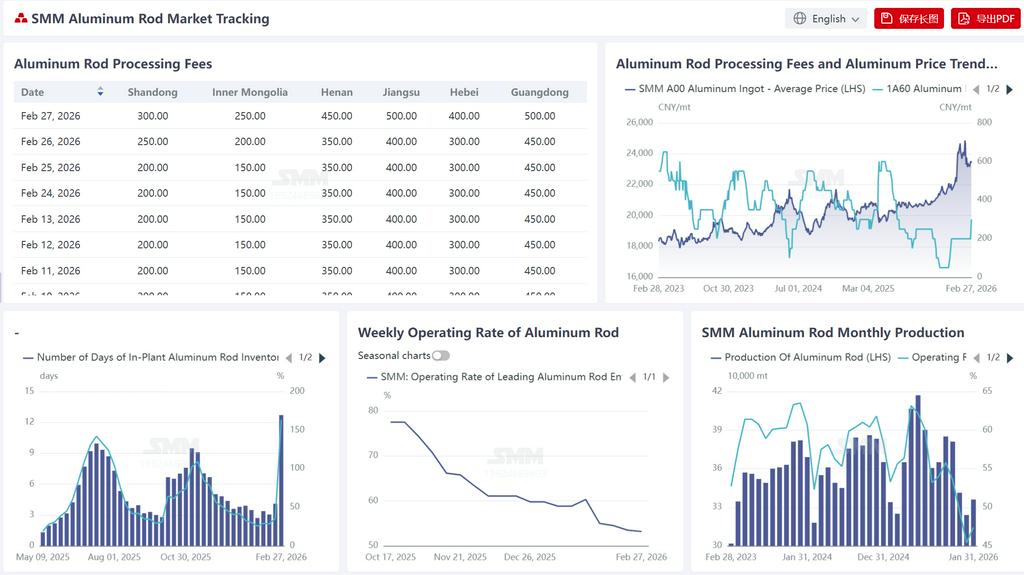 After the holiday, the center of aluminum prices rebounded compared to pre-holiday levels, but market trading sentiment had not fully recovered at the beginning of the new year. Processing fee quotes showed regional differentiation but overall held prices firm. Regarding different processing fees, as of February 28, 2026, the processing fee for aluminum rods in Jiangsu region was quoted at 450-550 yuan/mt, in Hebei at 350-450 yuan/mt, and in South China at 350-500 yuan/mt. Returning to the processing fees for aluminum rods in various regions, Shandong region was quoted at 250-350 yuan/mt, Inner Mongolia at 200-300 yuan/mt, and Henan at 400-450 yuan/mt. Despite the significant trend of inventory buildup for aluminum rods due to seasonal effects, the resumption of downstream consumption was better than expected before the holiday, with clear expectations for power grid deliveries in March. The demand from downstream wire and cable factories significantly rebounded, which will further promote a recovery in the trading sentiment of the aluminum rod market. Subsequent space for inventory buildup is relatively limited, and it is expected that the processing fee for aluminum rods in March will operate on a stable and slightly strong trend.