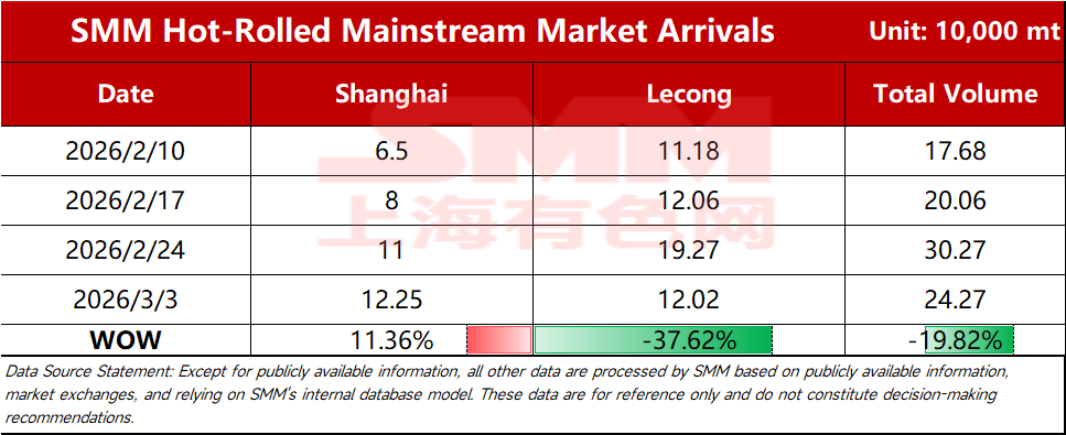 [SMM Hot-Rolled Arrivals] Arrivals in Major Mainstream Markets Pulled Back in the First Week After the Holiday