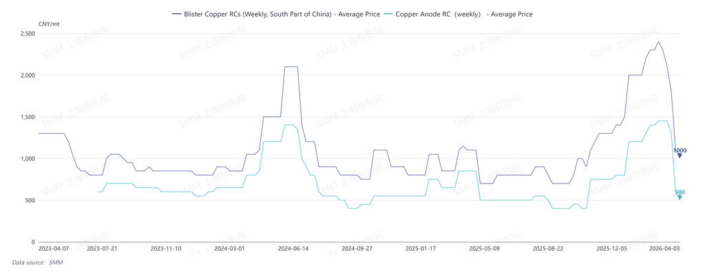SMM's March 2026 blister copper RC in south China were 1,600-2,000 yuan/mt, averaging 1,800 yuan/mt, down 550 yuan/mt MoM; blister copper RC in north China were 1,300-1,500 yuan/mt, averaging 1,400 yuan/mt, down 450 yuan/mt MoM; blister copper RC CIF China were $90-100/mt, averaging $95/mt, flat MoM.