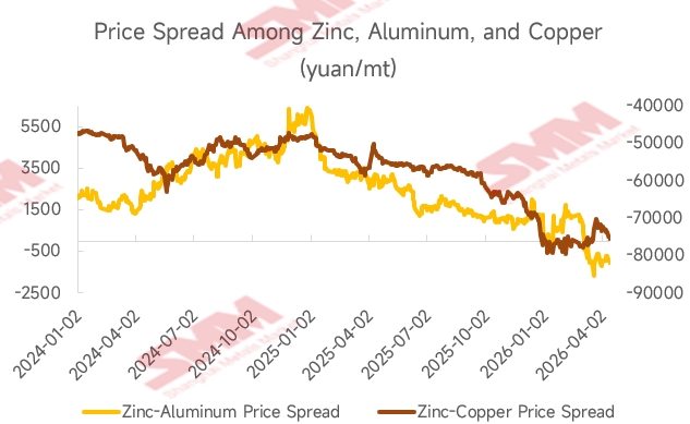 Since the escalation of tensions in the Middle East, the amplitude and frequency of non-ferrous metal price fluctuations have increased significantly, directly affecting the production costs of die-casting zinc alloy enterprises. According to SMM's 2026 data comparison, the average zinc-aluminum price spread and zinc-copper price spread before the tensions escalated (January 5, 2026 – February 27, 2026) were 778 yuan/mt and -77,224 yuan/mt, respectively. From March 2 to this Monday (April 13), the zinc-aluminum price spread shifted to -751 yuan/mt, while the zinc-copper price spread stood at -74,428 yuan/mt. Among these, the impact on Zamak #3 is more notable — the zinc-aluminum price spread turned from positive to negative, meaning that at the same zinc price level, the relative cost of aluminum has risen, directly pushing up the raw material costs for enterprises producing Zamak #3.