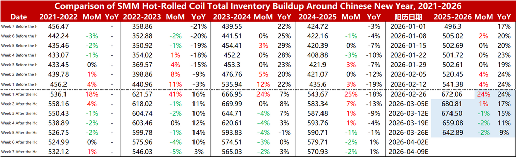 The total SMM hot-rolled coil inventory was 6.7206 million mt, up 1.3068 million mt WoW, up 24% WoW, and up 24% YoY on a lunar calendar basis, meeting previous expectations of a 20%–25% inventory increase in the first week after the holiday.