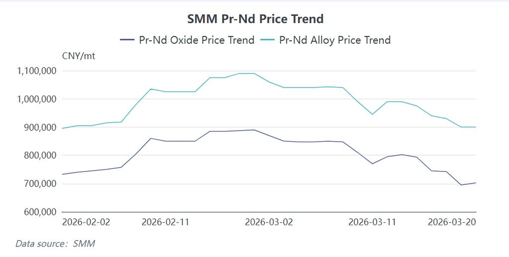 SMM News: As of March 20, 2026, the market price for Praseodymium-Neodymium (Pr-Nd) metal in China stabilized temporarily at 890,000–910,000 RMB/ton. However, a review of the entire month reveals a consistent downward trajectory. Compared to the high of 1.1 million RMB/ton on February 28, prices have plummeted by 200,000 RMB/ton in just three weeks, representing an 18.18% decline. While this correction was influenced by multiple factors—including macro-geopolitical tensions and subdued global growth expectations—the core driver, when stripping away short-term sentiment, is the substantive contraction in terminal demand for Pr-Nd. As the "barometer" of the rare earth permanent magnet industry chain, the health of downstream applications directly dictates the digestion rate of upstream raw materials. This article utilizes the SMM Pr-Nd Terminal Demand Calculation Model to dissect the demand logic for 2026 across three core sectors—New Energy Vehicles (NEVs), Internal Combustion Engine (ICE) vehicles, and Wind Power—explaining the current supply-demand dilemma facing the NdFeB magnet and broader Pr-Nd markets.