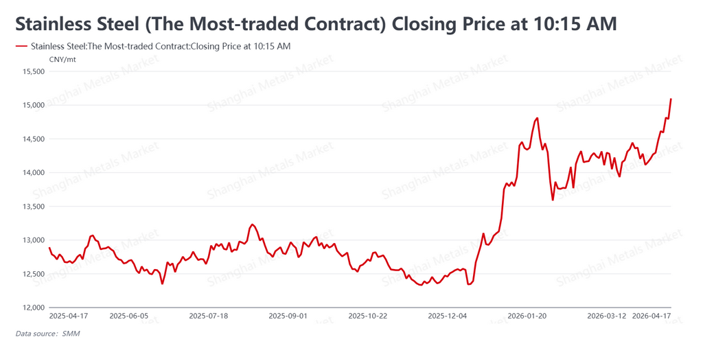 The SS2605 contract closed Friday at 15,095 yuan/mt (approx. $2,213/mt), up 625 yuan/mt (approx. $92/mt), or 4.32%, from the previous Friday's close of 14,470 yuan/mt (approx. $2,122/mt). The contract touched an intraday high of 15,175 yuan/mt (approx. $2,225/mt), setting a new multi-year peak. Notably, gains on the futures board significantly outpaced movements in the physical market and upstream raw materials, indicating that the rally was largely fund-driven rather than led by end-user demand.