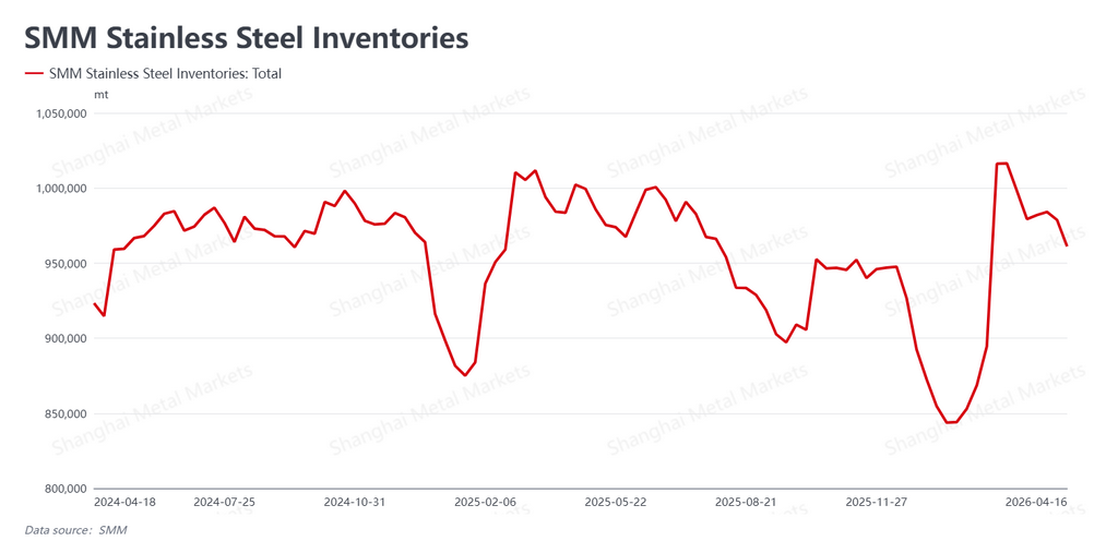Chinese social inventory of stainless steel fell to 961,100 mt this week from 978,000 mt a week earlier, a drawdown of 16,900 mt. The continued destocking reflects typical April seasonal strength — traditionally a peak consumption window in the Chinese market, sometimes referred to as "silver April." However, much of the buying was attributable to arbitrage players taking advantage of the futures rally rather than organic end-user demand.