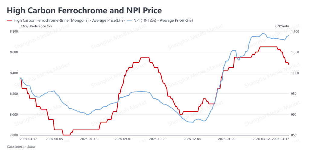 High-grade Nickel Pig Iron (NPI) rebounded in response, with prices recovering to 1,090 yuan per nickel point (approx. $160 per nickel point) by Friday. By contrast, high-carbon ferrochrome weakened to 8,475 yuan per 50-base mt (approx. $1,243 per 50-base mt). Because the futures rally has significantly outpaced NPI price appreciation, Chinese mill margins have improved meaningfully on a spot basis. However, this has also stretched the premium of futures prices over raw material costs, raising the risk of a pullback from current levels.
