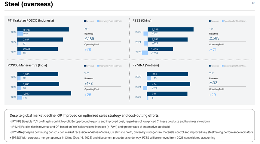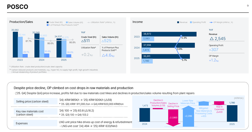 ① El precio de venta del acero al carbono bajó de 985.000 wones/t en 2024 a 926.000 wones/t en 2025, una caída de aproximadamente 59.000 wones/t.