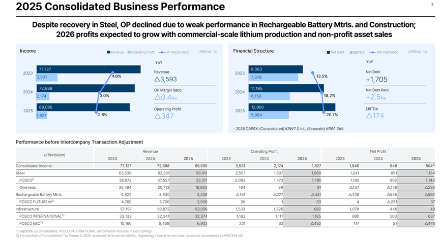POSCO Holdings Inc. publicó sus resultados consolidados de 2025, reportando ingresos de 69,095 billones de wones, beneficio operativo de 1,827 billones de wones y beneficio neto de 504.000 millones de wones. Los detalles del desempeño del segmento siderúrgico en 2025 son los siguientes.