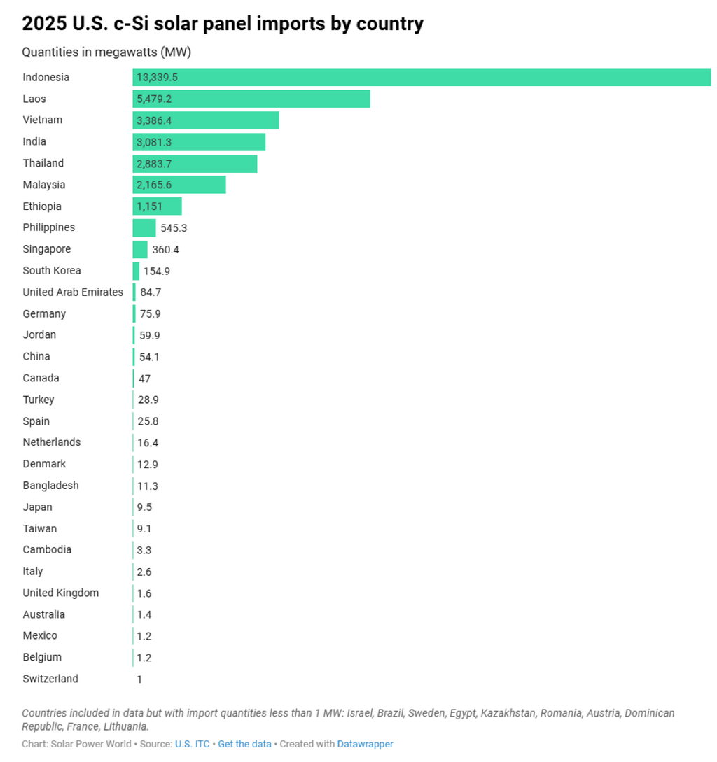 The United States has firmly established itself as the primary destination for Indian solar module exports. According to 2025 US International Trade Commission (ITC) import data for crystalline silicon (c-Si) solar panels, India's position in the US market remains solid: total annual shipments of c-Si modules to the US reached 3,081.3 MW, ranking India as the fourth-largest import source, behind only Indonesia, Laos, and Vietnam. India's market share stands at approximately 9.35%, reflecting a sustained upward trajectory from roughly 3% in 2022, and has become an indispensable component of the US solar supply chain ecosystem.