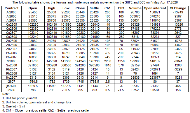 The following table shows the ferrous and nonferrous metals movement on the SHFE and DCE on 17 Apr , 2026