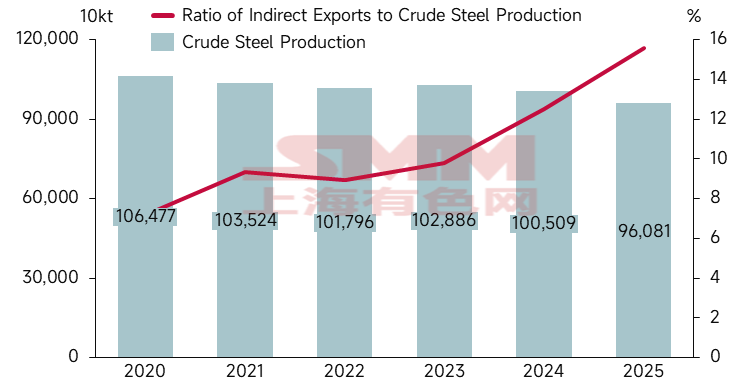 La campagne anti-involution en cours en Chine a formé une relation synergique avec les exportations indirectes d'acier, favorisant un passage de la « concurrence par les volumes » à la « montée en valeur ». En gouvernant la concurrence désordonnée en Chine et en orientant l'acier vers des formes d'exportation à plus forte valeur ajoutée (comme les automobiles et les machines), la montée en gamme industrielle peut être réalisée, transformant les exportations d'acier de la forme de « matières premières » vers des exportations de « pièces » ou de « produits finis » intégrés dans les chaînes d'approvisionnement mondiales. Avertissement sur les sources de données : les données autres que les informations publiquement disponibles sont dérivées par SMM à partir d'informations publiques, de communications de marché et des modèles de base de données internes de SMM, et sont fournies à titre indicatif uniquement sans constituer un conseil décisionnel.