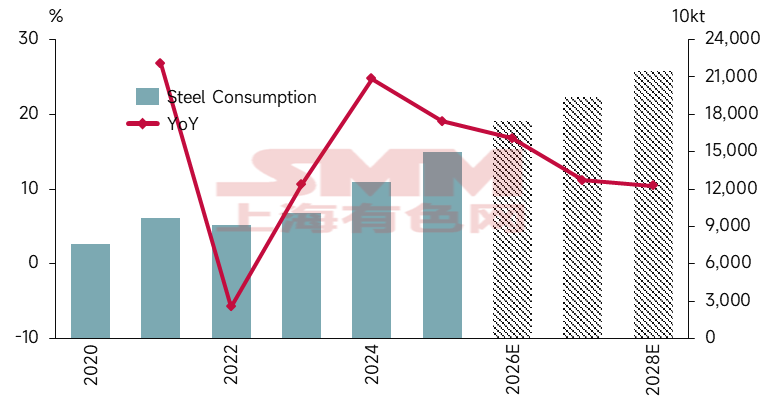 Globalement, SMM prévoit que les exportations indirectes d'acier augmenteront d'environ 17 % en 2026. À l'avenir, les exportations indirectes d'acier maintiendront une tendance de croissance solide, mais le taux de croissance ralentira progressivement. À long terme, le modèle d'exportation d'éléments ferreux reposant sur l'industrie manufacturière reste fiable, principalement porté par le renforcement mutuel entre l'échelle manufacturière et les capacités d'approvisionnement de la Chine d'une part, et la demande d'industrialisation et d'urbanisation des marchés émergents d'autre part.