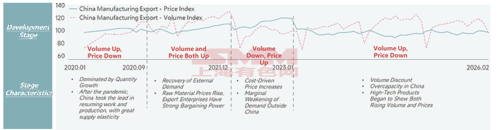 Contrairement à l'augmentation des exportations indirectes, l'indice des prix à l'exportation du secteur manufacturier chinois a reculé. En 2021, les indices des prix et des volumes à l'exportation du secteur manufacturier chinois ont affiché un phénomène rare de « hausse simultanée des prix et des volumes », porté par la reprise progressive de l'économie mondiale — notamment la reprise soutenue de la production en Europe et aux États-Unis — qui a stimulé les exportations chinoises de produits liés à la production. Les hausses de prix étaient principalement tirées par les coûts, les prix des matières premières en amont (métaux non ferreux, acier, etc.) ayant fortement augmenté, aggravés par les pénuries des chaînes d'approvisionnement mondiales et la flambée des taux de fret maritime. Au cours des quatre années suivantes, les prix et les volumes ont affiché des tendances clairement opposées. En février 2026, l'indice des prix à l'exportation du secteur manufacturier chinois s'établissait à 97,4, en baisse de 8,2 par rapport à son plus haut historique sur la même période, tandis que l'indice des volumes à l'exportation s'établissait à 95,9, en hausse de 20,9 par rapport à son plus haut historique sur la même période. Cela indique que les exportations manufacturières chinoises restent dans une phase relativement fragile de « volumes en hausse, prix en baisse ».