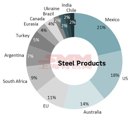Cependant, ce modèle de « demande intérieure insuffisante compensée par les exportations » se heurtait à des défis extérieurs de plus en plus sévères. Depuis 2020, les industries liées aux exportations indirectes d'acier de la Chine ont fait l'objet de 143 enquêtes antidumping à l'étranger (comptabilisées selon la date de leurs dernières évolutions). Les produits sidérurgiques étant impliqués dans le plus grand nombre de cas, ils sont présentés sous forme de diagramme circulaire, qui montre que le Mexique, les États-Unis et l'Australie ont engagé le plus d'actions antidumping contre les produits sidérurgiques chinois, représentant ensemble plus de 50 %.