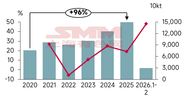 En 2025, les exportations indirectes totales d'acier de la Chine ont augmenté d'environ 96 % par rapport à 2020. Au cours des deux premiers mois de 2026, les exportations indirectes cumulées d'acier ont totalisé 29,43 millions de tonnes, avec un taux de croissance en glissement annuel de 48,07 %.