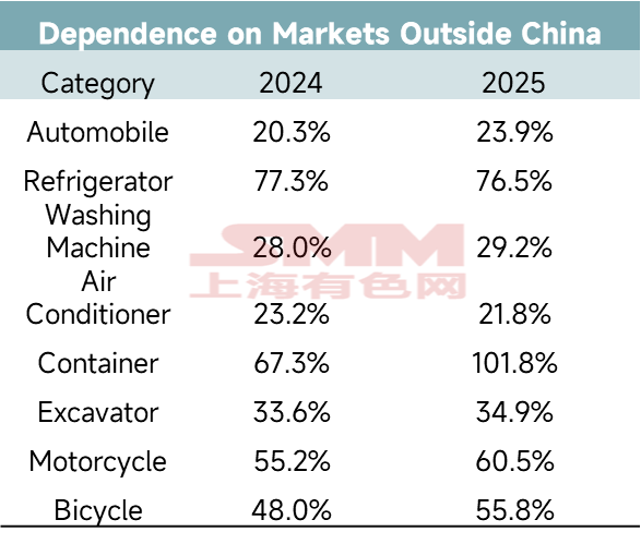 En examinant la dépendance extérieure de certaines grandes industries, celle des conteneurs a dépassé 100 % en 2025, principalement parce que les données d'exportation reflétaient non seulement la production de la période en cours, mais aussi le déstockage des inventaires antérieurs. En 2024, en raison de la « crise de la mer Rouge », le secteur est entré dans un mode de « stockage frénétique », puis en 2025, à mesure que l'impact de la crise s'estompait, il est passé à un mode de « déstockage rationnel ». Les réfrigérateurs occupaient le deuxième rang en termes de dépendance extérieure. L'ajustement structurel de la capacité mondiale de réfrigérateurs, caractérisé par une « montée à l'Est et un déclin à l'Ouest », a offert une opportunité historique aux exportations chinoises de réfrigérateurs. Suivaient de près les motos et les vélos, pour lesquels la contraction du marché chinois n'a laissé d'autre choix que de chercher l'« océan bleu de la demande » dans les pays d'Amérique latine.