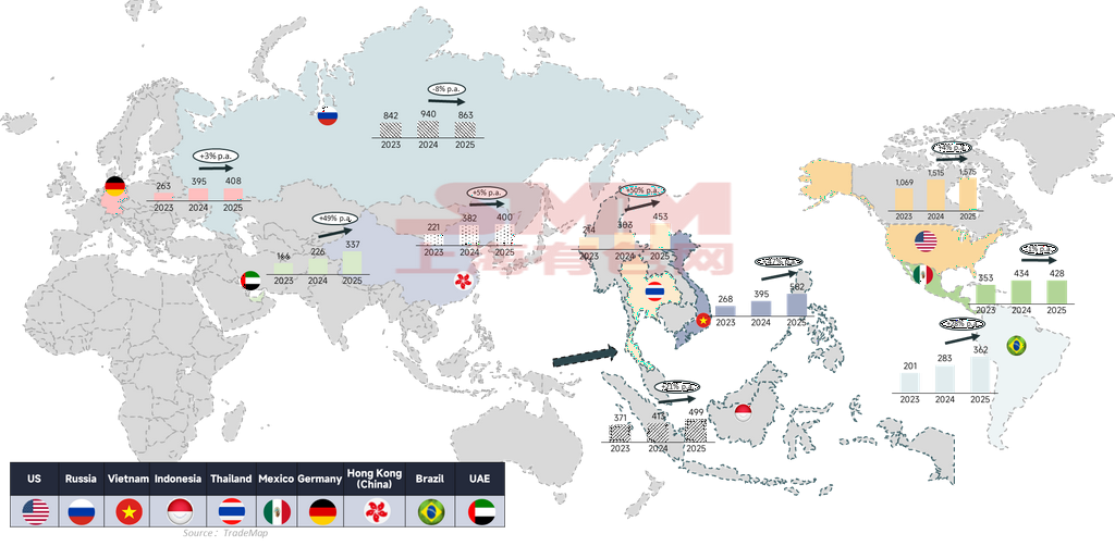 D'après l'évolution historique du top 10 des destinations des exportations indirectes d'acier de la Chine, le taux de croissance annuel composé des principaux marchés de destination traditionnels — les pays européens et américains — s'est réduit, tandis que les marchés de destination menés par l'Asie du Sud-Est et le Moyen-Orient ont progressé rapidement avec un taux de croissance annuel composé supérieur à 20 %. La part des États-Unis dans les exportations indirectes d'acier de la Chine a également diminué, passant de 15 % en 2020 à 10 % en 2025. Parallèlement, les parts des principaux pays d'Asie du Sud-Est et des Émirats arabes unis sont passées respectivement de 8 % et 1,2 % à 10,3 % et 2,3 %.