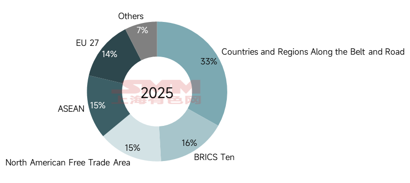 Selon le modèle d'exportation indirecte de SMM, en 2025, la consommation totale d'acier de la Chine pour les exportations indirectes vers les pays et régions le long de l'initiative « la Ceinture et la Route » a atteint 49,5966 millions de tonnes, représentant 33 % du total des exportations indirectes d'acier de la Chine, une part largement inchangée par rapport à 2020. Les zones économiques ayant connu les changements les plus notables étaient principalement l'ALENA, l'UE-27, l'ASEAN et les BRICS Dix. Parmi elles, l'ALENA et l'UE-27 ont affiché une tendance à la baisse, avec des parts en recul de 4 % et 3 % respectivement ; l'ASEAN et les BRICS Dix ont affiché une tendance à la hausse, avec des parts en progression de 2 % et 5 % respectivement. Les volumes supplémentaires provenant de ces régions ont efficacement compensé le déficit laissé par la baisse des exportations vers l'Europe et les États-Unis. En 2025, la part des exportations indirectes d'acier de la Chine vers les États-Unis a diminué de 4 % par rapport à 2020, la part vers le Japon a reculé de 2 %, et la part vers l'Allemagne a baissé de 2 %, certains pays européens ayant même été retirés du top 15 des destinations d'exportation (les Pays-Bas). Les pays de l'ASEAN ont connu une demande de plus en plus robuste pour les véhicules à énergies nouvelles, le photovoltaïque et les appareils intelligents. La signature de la Zone de libre-échange Chine-ASEAN 3.0 a ajouté des chapitres sur l'économie numérique et l'économie verte, supprimant les barrières institutionnelles pour ces exportations de produits. Les pays des BRICS ont affiché une demande robuste en infrastructures et en agriculture, stimulant directement les exportations chinoises d'équipements connexes. D'autre part, de nombreux pays de l'ASEAN ont importé des pièces essentielles et des produits intermédiaires de Chine, les ont assemblés localement, puis les ont réexportés à l'échelle mondiale, formant un réseau de division du travail dans la chaîne industrielle de « R&D en Chine, production dans les pays voisins, marchés mondiaux ».