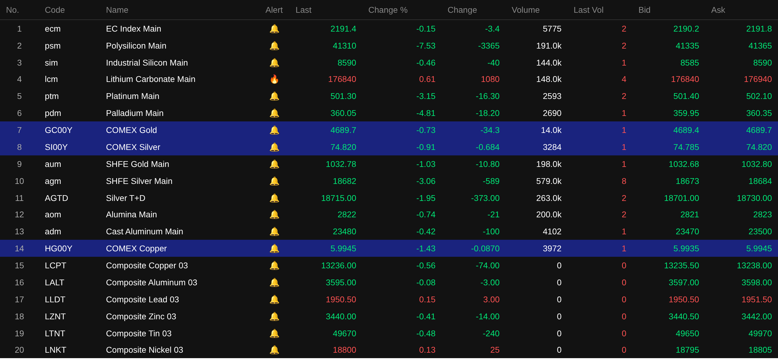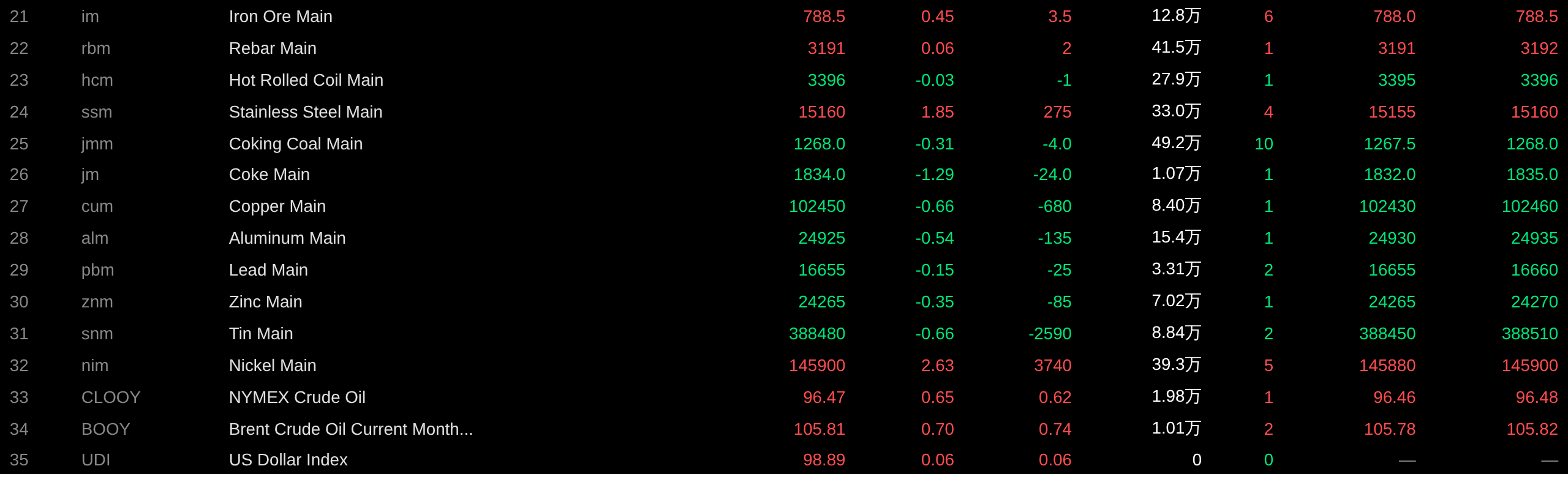 Par ailleurs, les contrats à terme les plus négociés sur l'aluminium de fonderie ont baissé de 0,42 % et ceux sur l'alumine ont reculé de 0,74 %. Les contrats à terme les plus négociés sur le carbonate de lithium ont progressé de 0,62 %. Les contrats à terme les plus négociés sur le silicium métal ont baissé de 0,46 %. Les contrats à terme les plus négociés sur le polysilicium ont chuté de 7,53 %.