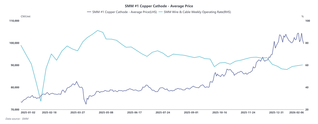 During the week of February 6–12, the operating rate of SMM copper wire and cable enterprises was 56.01%, down 4.13 percentage points WoW. This week marked the final production week before the Chinese New Year holiday for the industry, with most enterprises gradually halting operations by the end of the week. Looking ahead to next week, enterprises across the industry will essentially enter the Chinese New Year holiday in full swing, with only a few enterprises retaining orders on hand keeping part of their capacity operational. SMM expects the operating rate of copper wire and cable to drop 40.81 percentage points WoW to 15.2% next week.