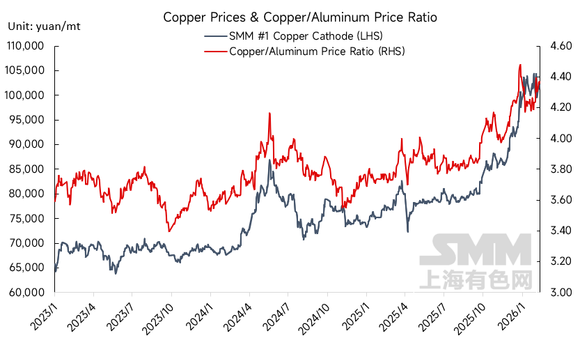 The copper/aluminum price ratio keeps expanding; driven by cost factors, the substitution trend of aluminum for copper is emerging in home appliances, medium- and low-voltage power distribution and other downstream fields, diverting part of copper wire and cable demand. Yet inherent performance shortcomings of aluminum wire and cable mean technical barriers remain; in high-end cables and other performance-critical segments, aluminum still cannot replace the core advantages of copper. In 2026, progress in aluminum cable technology and the copper/aluminum price ratio must be tracked continuously; if the ratio keeps widening, watch whether its cost advantage can accelerate technical breakthroughs and intensify substitution pressure on copper wire and cable.