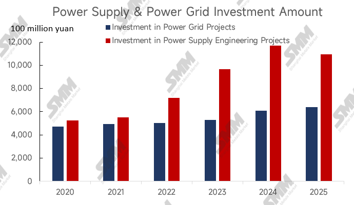 The estimated volume of copper tenders in 2025 continued to follow the seasonal fluctuation pattern of previous years, but the overall amplitude widened significantly. The scale of centralized tender periods was notably higher than in the previous two years, while tender volumes during the off-season contracted further. Among these, the MoM increase in October was the most pronounced, driven by higher State Grid investment in 2025 compared to previous years, as well as the impact of high copper prices and weak demand earlier in the year, which slowed the tender pace and limited volume releases. Additionally, as 2025 marked the final year of the 14th Five-Year Plan, power grid investment entered a concentrated year-end push, collectively driving tender volumes in October significantly above earlier levels. It is worth noting that copper prices continued to break historical highs in H2 2025, leading many projects to complete tenders but delay orders. It was only after copper prices entered a correction phase in 2026 that previously awarded orders began to be executed gradually. Although investment in power supply projects declined, this reflects a normal transition in the energy sector from rapid expansion to high-quality development. For the wire and cable industry, this shift represents a change in demand structure rather than a loss of overall rigid demand in the power sector. The growth focus has simply shifted from power generation capacity to grid construction.
