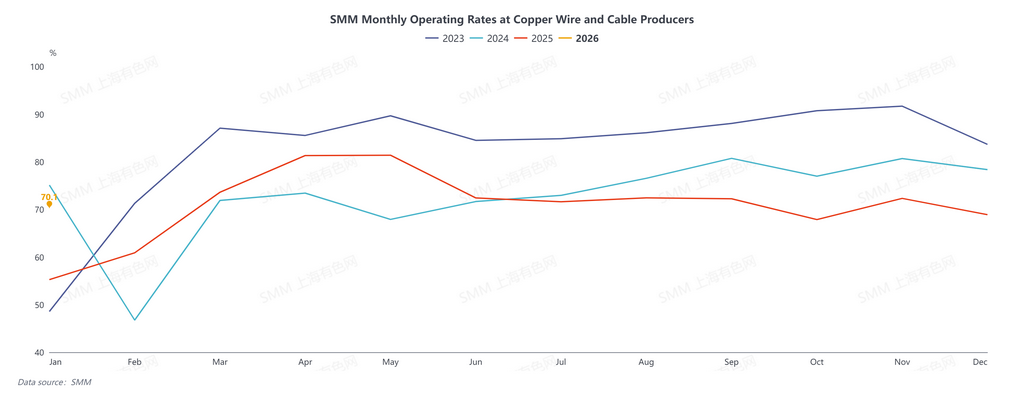 In 2025, the operating rate of copper wire and cable enterprises displayed a pattern of “stage-by-stage fluctuations, overall weakness for the year”; the industry-average rate was 70.85 %, down 1.89 percentage points YoY. Although traditional power grids remained the core source of orders, the H2 PV installation rush ended, copper prices climbed and dragged orders lower, while demand in construction and other conventional segments stayed slack, keeping the operating rate under broad pressure.