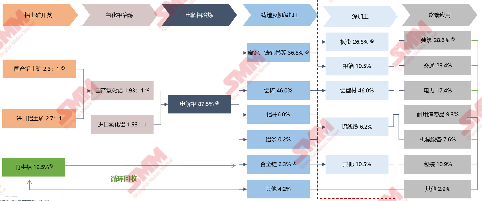 The consumption source of the domestic aluminum industry chain is divided into two parts: primary aluminum and recycled aluminum. Primary aluminum accounts for the vast majority of domestic aluminum consumption, and recycled aluminum is the supplement. There are great differences in aluminum consumption drivers among different industries, and construction and transportation sectors are the two main industries. In terms of deep processing, aluminum profile and aluminum plate, strip and foil are the two main parts.