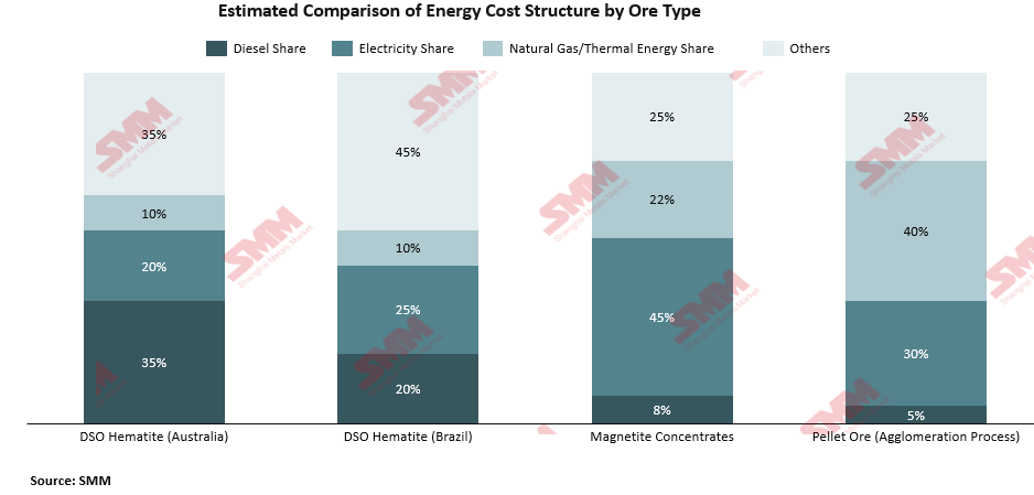 Sifat fisik dan kimia bijih besi secara fundamental menentukan kompleksitas proses ekstraksi dan benefisiasinya, serta struktur konsumsi energinya. Perbedaan struktural ini selanjutnya memengaruhi ketergantungan setiap tambang terhadap berbagai jenis energi dan sensitivitasnya terhadap harga. Berdasarkan jenis bijih, aset bijih besi global arus utama secara umum dapat diklasifikasikan menjadi dua kategori: bijih hematit pengapalan langsung (DSO) dan konsentrat magnetit.