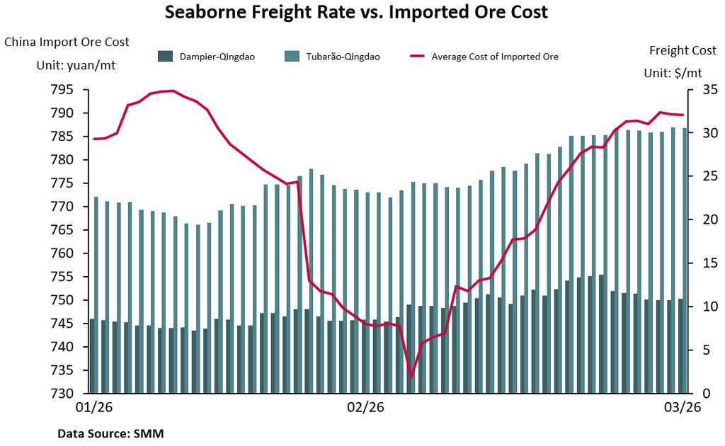 Dari perspektif makroekonomi, keempat tambang besar terkena dampak tambahan dari fluktuasi nilai tukar AUD/BRL terhadap USD. Pelemahan mata uang lokal dapat berfungsi sebagai lindung nilai yang efektif ketika biaya energi naik, dan sebaliknya. Hal ini juga menjelaskan mengapa, dalam siklus inflasi energi yang sama, fluktuasi biaya C1 dalam denominasi USD biasanya tidak sepenuhnya sinkron dengan kenaikan harga minyak mentah. Selain itu, bijih besi harus melalui fase pengiriman dalam perjalanannya ke pelabuhan Tiongkok. Kenaikan biaya bahan bakar minyak secara langsung mendorong naiknya tarif angkutan di rute C3 (Brasil ke Tiongkok) dan C5 (Australia Barat ke Tiongkok). Bersamaan dengan itu, ketegangan regional di Timur Tengah telah meningkatkan risiko pengiriman, dan lonjakan tarif asuransi secara bersamaan mendorong naiknya biaya impor bijih besi. Akumulasi berbagai faktor ini dapat mengakibatkan premi angkutan bijih besi di rute terkait melebihi $10-$15 per ton.