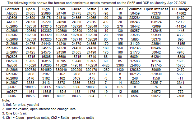 The following table shows the ferrous and nonferrous metals movement on the SHFE and DCE on 27 Apr , 2026