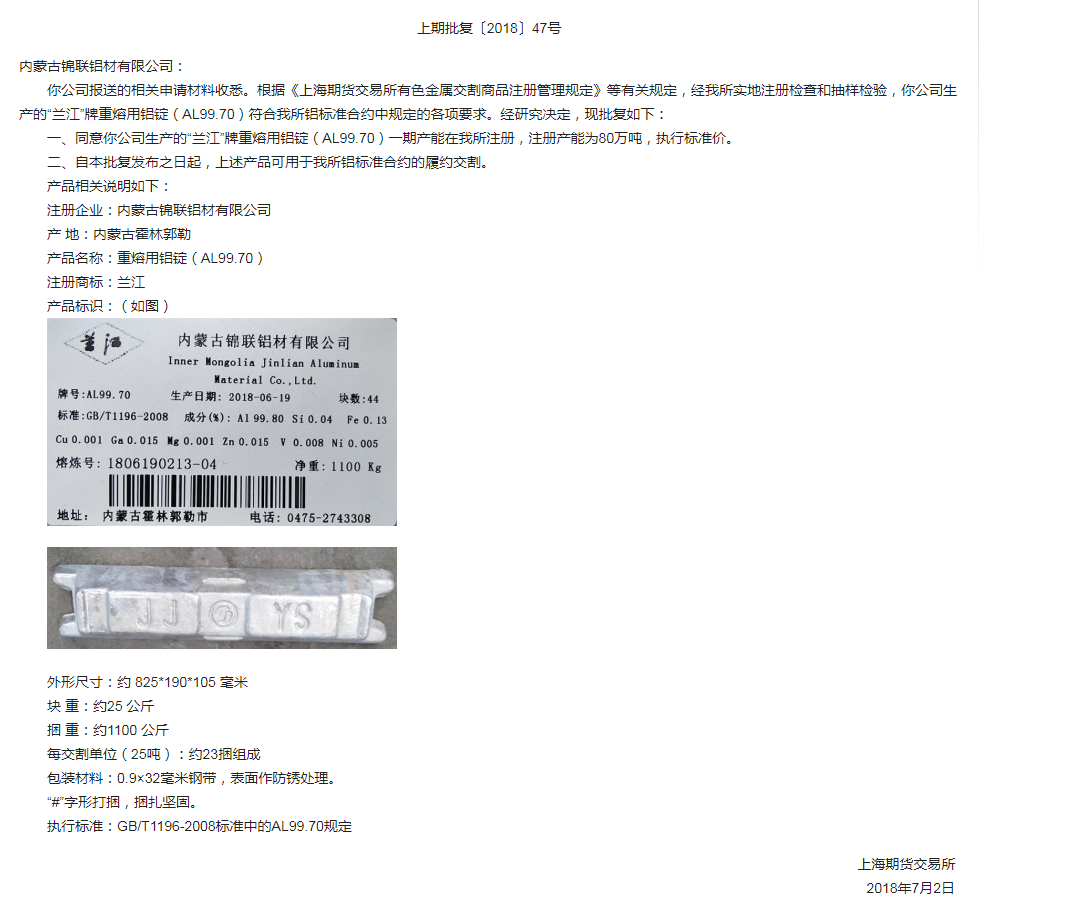 July 2: July 2, the previous issue on the approval of Inner Mongolia Jinlian Aluminum Co., Ltd. "Lanjiang" brand remelting aluminum ingots registration notice. The details of the notification are as follows: