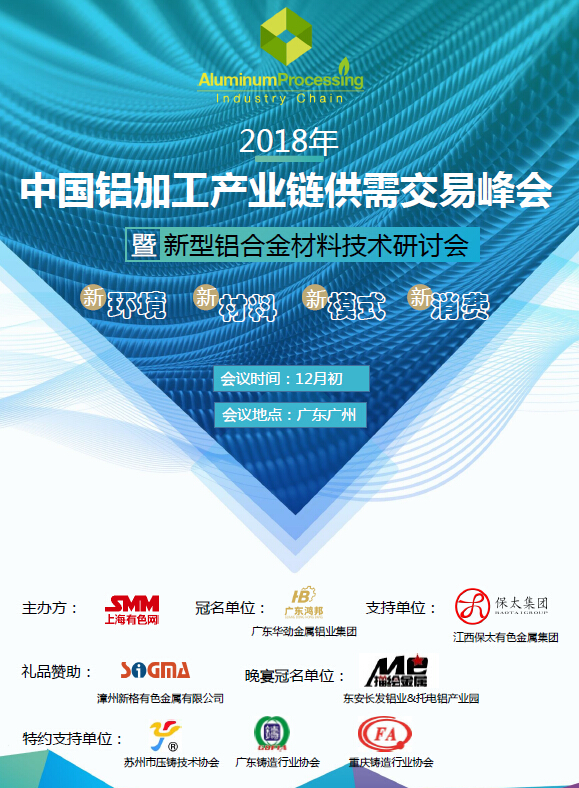 In December 2018, at the 2018 China Aluminum processing Industry supply and demand Trade Summit, SMM will invite entrepreneurs and related experts from the aluminum processing industry to gather in Guangzhou, Guangdong Province, the bridgehead of China's aluminum processing industry. The purpose of this paper is to gather the wisdom of all parties, to seek new ideas for the upgrading of the aluminum processing industry, and to enhance the overall market competitiveness of China's aluminum processing industry.