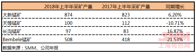 Mining activities, according to the latest data, Citic Daxin Manganese Mine in the first half of 2018, Daxin Manganese Mine total mining 874 kilotons, Tiandao Manganese Mine 100 kilotons, Changgou Manganese Mine 97 kilotons, Bembele Manganese Mine 505 kilotons.