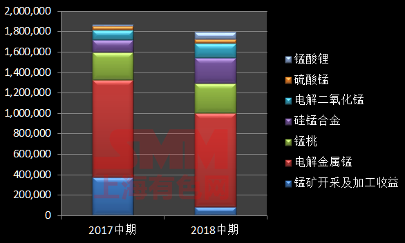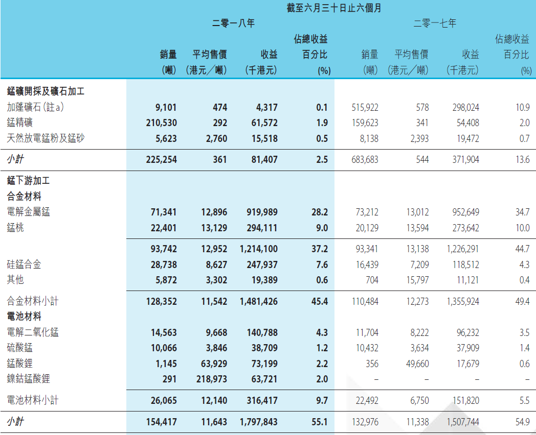 Citic manganese, for example, earned HK $81407, 000 from manganese mining and processing in the first half of the year, down 78.1% from HK $371904 in 2017, mainly due to a decline in sales of ore from Gabon in the first half of the year. The main product electrolytic manganese is slightly reduced, the company believes that the market continues to stagnate because of the overall steel output, and the production capacity and output of electrolytic manganese are saturated with the first half of 2018, so the income of electrolytic manganese changes gently.