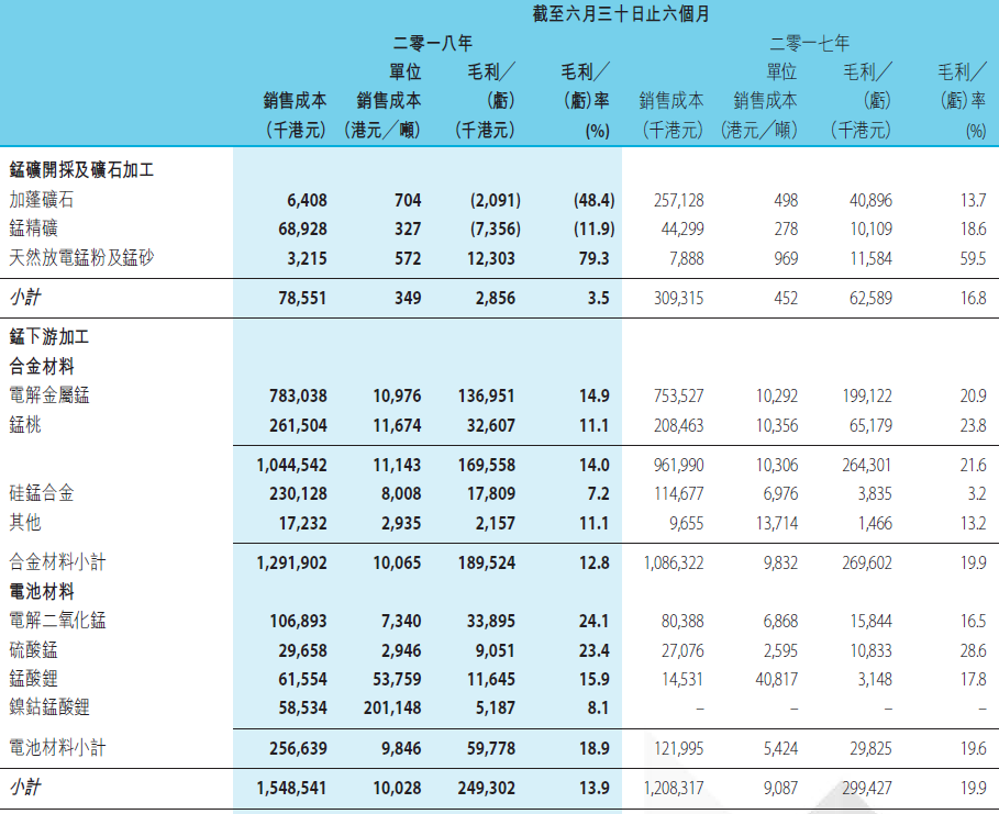 Cost: the company strives to reduce unit production costs and maintain competitiveness in the manganese industry by improving production processes and conducting constant negotiations with upstream suppliers on raw material prices and energy consumption. The unit production cost ratio of major products remained stable in the first half of 2018. Citic Manganese will continue to look for ways to improve production efficiency and control costs. To sum up, due to the fall in the market price of manganese products, the gross profit margin and gross profit contribution of the company's main products electrolytic manganese and manganese peaches decreased in the first half of 2018 compared with the same period last year.