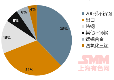 Electrolytic manganese refers to the manganese salt obtained by acid leaching of manganese ore and sent to the electrolytic cell to precipitate the simple metal. Because manganese can improve the strength, toughness, wear resistance and corrosion resistance of the alloy, it is often used to increase the hardness of metal materials. The most widely used are manganese copper alloy, manganese aluminum alloy, 200 series stainless steel, of which 200 series stainless steel has the greatest demand for electrolytic manganese. In 2017, the domestic iron and steel industry (including stainless steel and special steel) accounted for about 86% of the domestic downstream demand for electrolytic manganese. The purchase of electrolytic manganese in overseas market is mainly used in the production of special steel and high silicon steel.